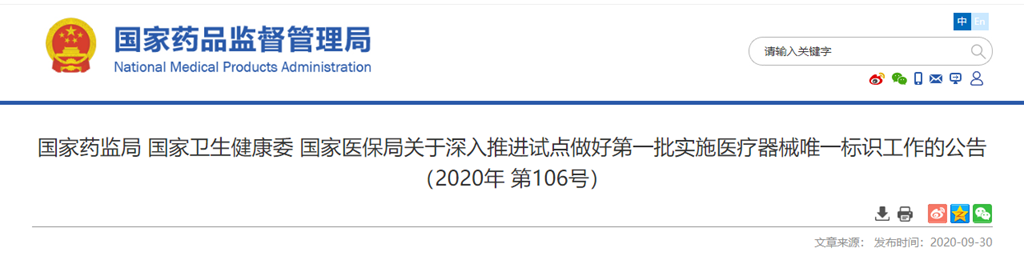 國家藥監(jiān)局 國家衛(wèi)生健康委 國家醫(yī)保局關(guān)于深入推進(jìn)試點(diǎn)做好第一批實施醫(yī)療器械唯一標(biāo)識工作的公告