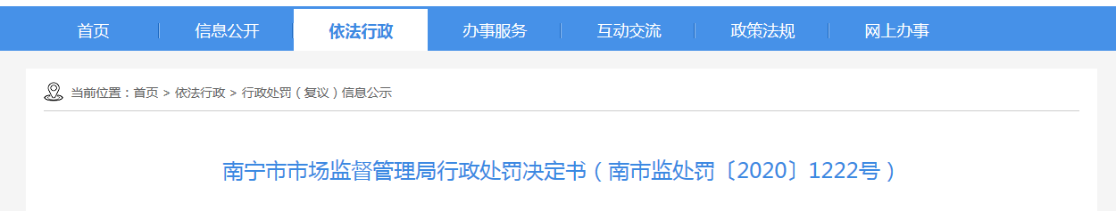 南寧市市場監(jiān)督管理局行政處罰決定書(南市監(jiān)處罰〔2020〕1222號)