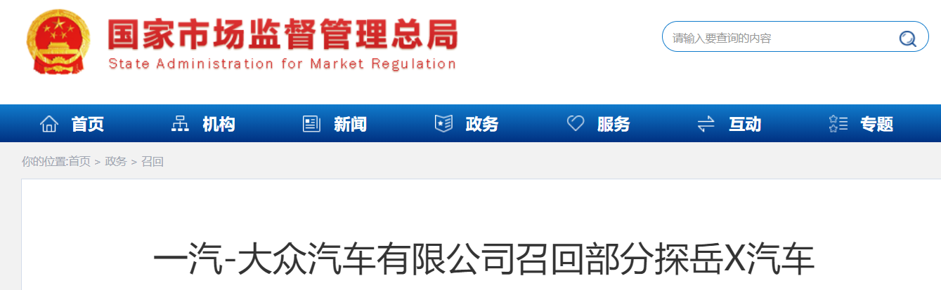 中國質(zhì)量新聞網(wǎng)訊 日前,一汽-大眾汽車有限公司根據(jù)《缺陷汽車產(chǎn)品召回管理條例》和《缺陷汽車產(chǎn)品召回管理條例實施辦法》的要求,向國家市場監(jiān)督管理總局備案了召回計劃,決定自即日起,召回2020年7月7日至2020年8月15日期間生產(chǎn)的部分探岳X汽車,共計762臺。