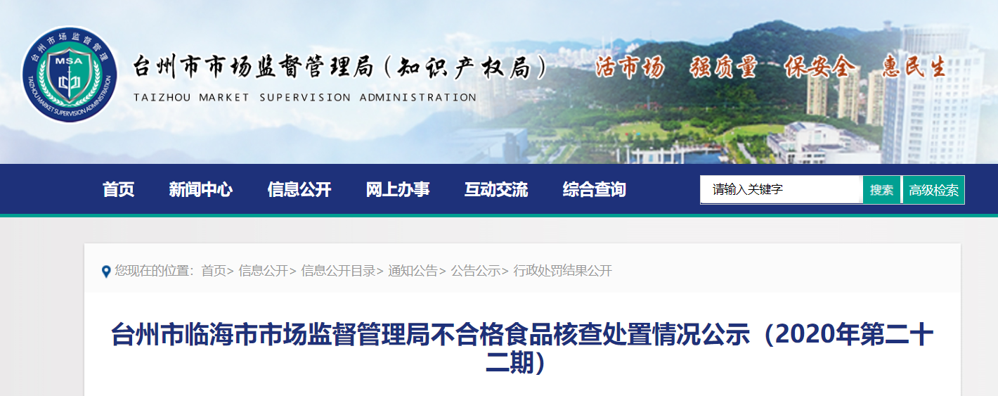 中國(guó)質(zhì)量新聞網(wǎng)訊 10月10日,浙江省臺(tái)州市市場(chǎng)監(jiān)督管理局網(wǎng)站發(fā)布《臺(tái)州市臨海市市場(chǎng)監(jiān)督管理局不合格食品核查處置情況公示(2020年第二十二期)》。