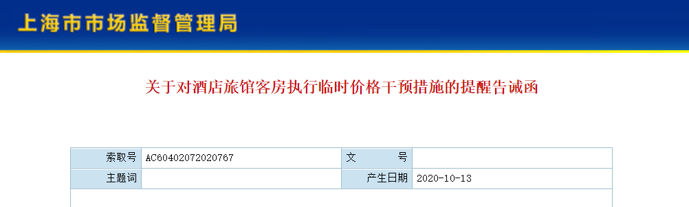 中國質(zhì)量新聞網(wǎng)訊 10月13日,上海市市場監(jiān)督管理局網(wǎng)站發(fā)布關(guān)于對酒店旅館客房執(zhí)行臨時(shí)價(jià)格干預(yù)措施的提醒告誡函。
