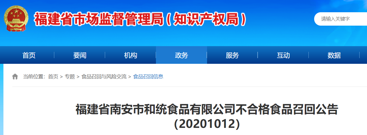 福建省南安市和統(tǒng)食品有限公司不合格食品召回公告(20201012)