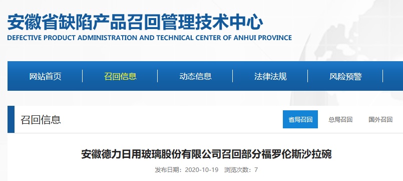 中國質(zhì)量新聞網(wǎng)訊 (記者陳娟女) 據(jù)安徽省缺陷產(chǎn)品召回管理技術(shù)中心網(wǎng)站2020年10月19日消息,日前,安徽德力日用玻璃股份有限公司按照《消費品召回管理暫行規(guī)定》的要求,主動向安徽省市場監(jiān)督管理局、滁州市市場監(jiān)督管理局報告了召回計劃,將自即日起,召回2019年5月6日-5月7日期間生產(chǎn)的福羅倫斯沙拉碗,涉及數(shù)量為15200只。