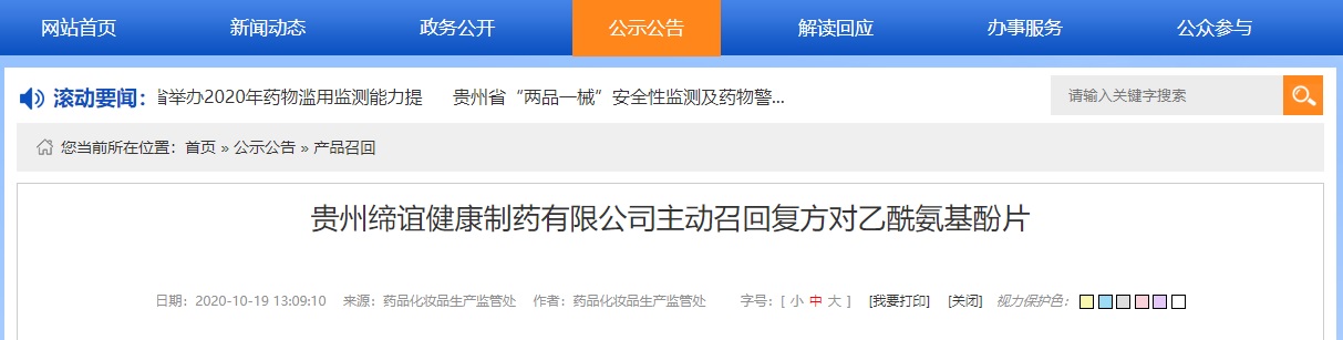 中國(guó)質(zhì)量新聞網(wǎng)訊 據(jù)貴州省藥品監(jiān)督管理局網(wǎng)站2020年10月19日消息,日前,貴州省藥品監(jiān)督管理局收到貴州締誼健康制藥有限公司報(bào)告,為保護(hù)患者安全,消除可能存在所有風(fēng)險(xiǎn)隱患,按照《藥品召回管理辦法》等相關(guān)規(guī)定,主動(dòng)召回3批復(fù)方對(duì)乙酰氨基酚片,涉及產(chǎn)品的詳細(xì)信息見(jiàn)公司召回通知和進(jìn)展情況。