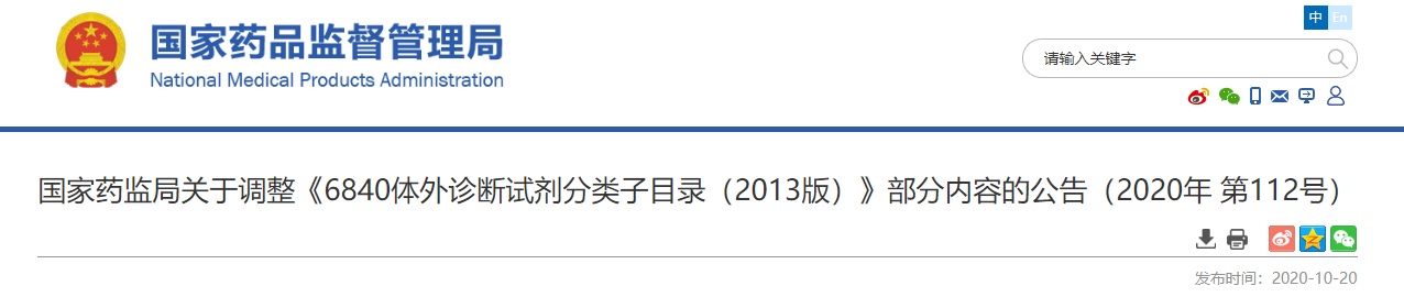 為進(jìn)一步深化醫(yī)療器械審評(píng)審批制度改革,依據(jù)醫(yī)療器械產(chǎn)業(yè)發(fā)展和監(jiān)管工作實(shí)際,按照《醫(yī)療器械監(jiān)督管理?xiàng)l例》有關(guān)要求,國家藥監(jiān)局決定對(duì)《6840體外診斷試劑分類子目錄(2013版)》進(jìn)行調(diào)整?,F(xiàn)將有關(guān)事項(xiàng)公告如下: