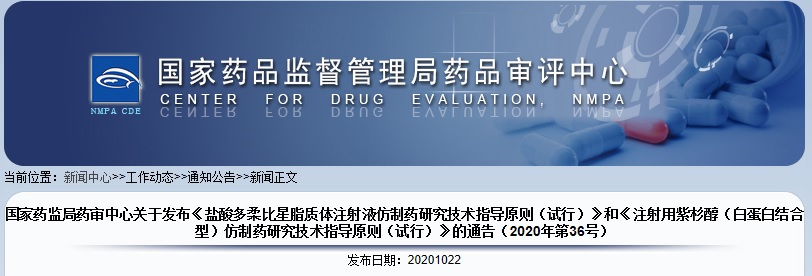 國家藥監(jiān)局藥審中心關(guān)于發(fā)布《鹽酸多柔比星脂質(zhì)體注射液仿制藥研究技術(shù)指導(dǎo)原則(試行)》和《注射用紫杉醇(白蛋白結(jié)合型)仿制藥研究技術(shù)指導(dǎo)原則(試行)》的通告(2020年第36號)