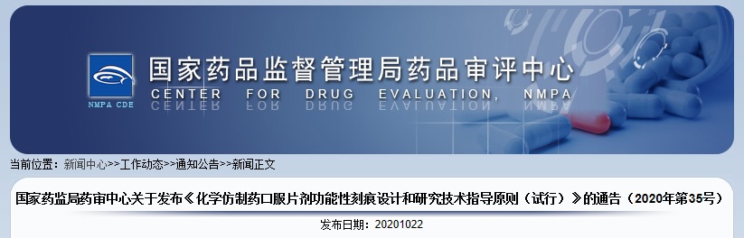 國家藥監(jiān)局藥審中心關(guān)于發(fā)布《化學(xué)仿制藥口服片劑功能性刻痕設(shè)計和研究技術(shù)指導(dǎo)原則(試行)》的通告(2020年第35號)