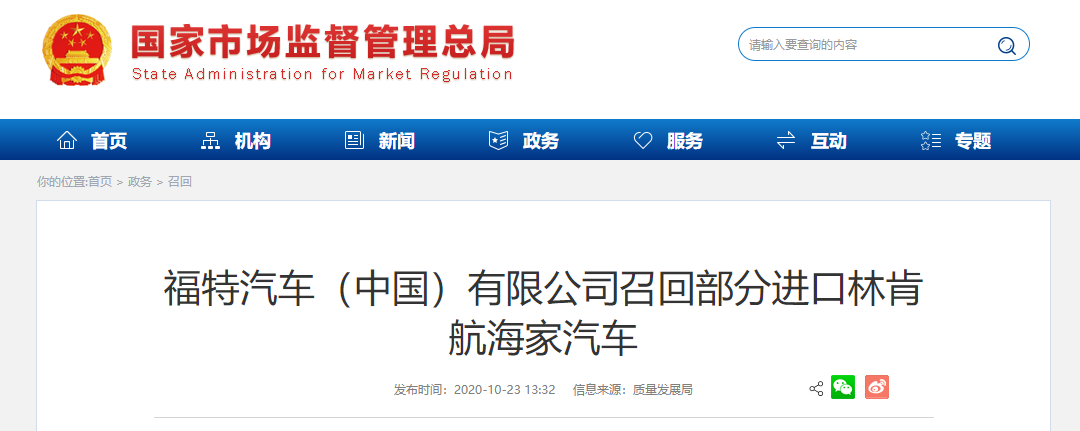 中國(guó)質(zhì)量新聞網(wǎng)訊 據(jù)市場(chǎng)監(jiān)管總局網(wǎng)站10月23日消息,日前,福特汽車(中國(guó))有限公司根據(jù)《缺陷汽車產(chǎn)品召回管理?xiàng)l例》和《缺陷汽車產(chǎn)品召回管理?xiàng)l例實(shí)施辦法》的要求,向國(guó)家市場(chǎng)監(jiān)督管理總局備案了召回計(jì)劃。決定從2020年10月23日起,召回2019年8月16日至2020年6月17日生產(chǎn)的部分2019-2020年款進(jìn)口林肯航海家汽車,共計(jì)4臺(tái)。