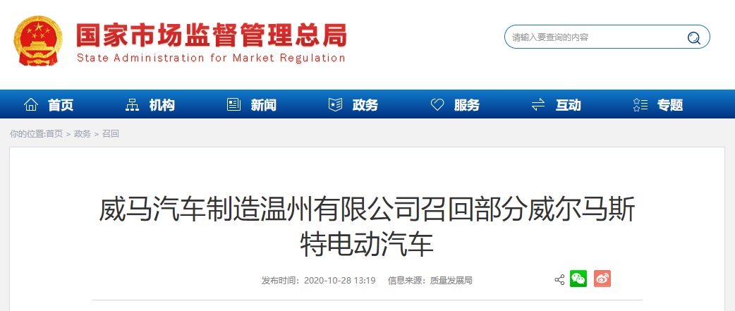 中國質量新聞網(wǎng)訊 據(jù)國家市場監(jiān)督管理總局網(wǎng)站2020年10月28日消息,日前,威馬汽車制造溫州有限公司根據(jù)《缺陷汽車產(chǎn)品召回管理條例》和《缺陷汽車產(chǎn)品召回管理條例實施辦法》的要求,向國家市場監(jiān)督管理總局備案了召回計劃。決定自2020年10月28日起,召回2020年6月8日至2020年9月23日生產(chǎn)的,裝備了電芯型號為ZNP3914895A-75A的動力電池的部分2020款威爾馬斯特電動汽車,共計1282輛。