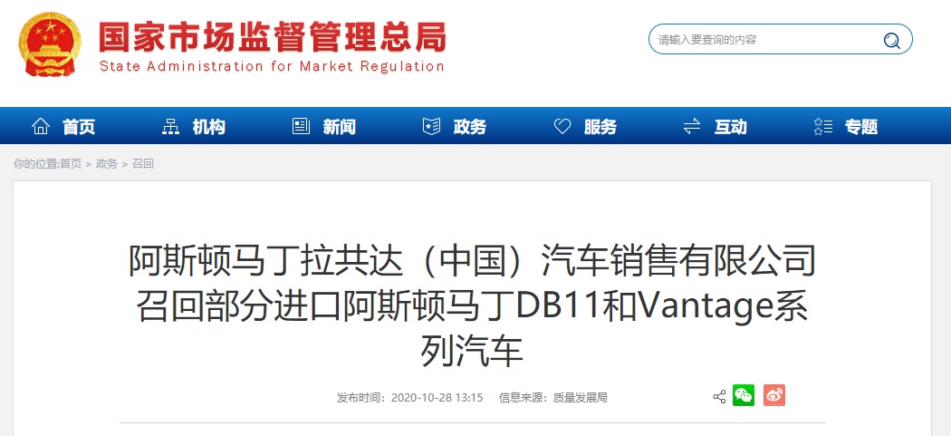 中國質(zhì)量新聞網(wǎng)訊 據(jù)國家市場監(jiān)督管理總局網(wǎng)站2020年10月28日消息,日前,阿斯頓馬丁拉共達(中國)汽車銷售有限公司向國家市場監(jiān)督管理總局備案了召回計劃。自即日起,召回2017年5月23日至2018年6月29日期間生產(chǎn)的部分進口2017-2019年款阿斯頓馬丁DB11和Vantage系列汽車,共計3輛。