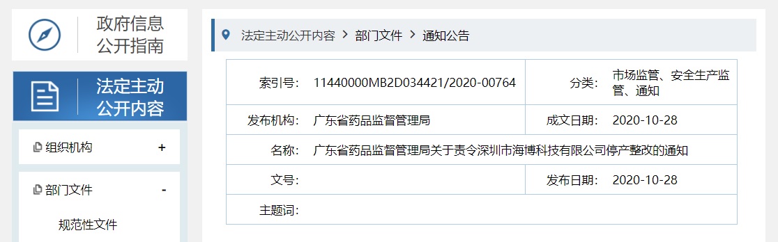 廣東省藥品監(jiān)督管理局關(guān)于責(zé)令深圳市海博科技有限公司停產(chǎn)整改的通知