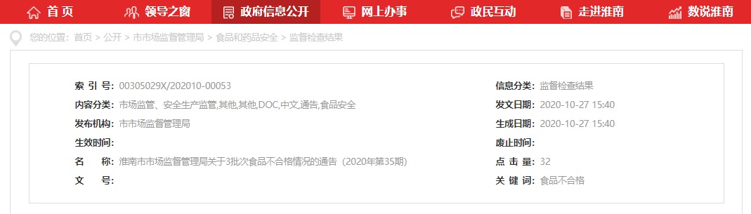 中國(guó)質(zhì)量新聞網(wǎng)訊 (記者陳娟女) 據(jù)安徽省淮南市人民政府網(wǎng)站2020年10月27日消息,淮南市市場(chǎng)監(jiān)督管理局發(fā)布關(guān)于3批次食品不合格情況的通告(2020年第35期)。