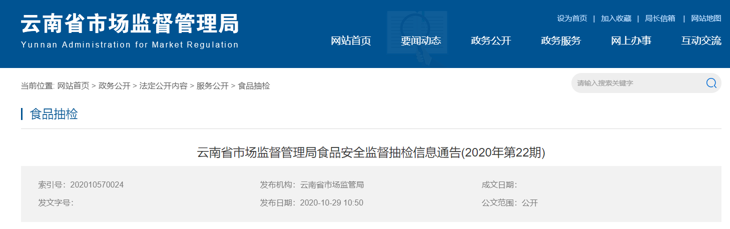 中國質(zhì)量新聞網(wǎng)訊 (記者 徐遠官) 10月29日,云南省市場監(jiān)督管理局官網(wǎng)發(fā)布食品安全監(jiān)督抽檢信息通告(2020年第22期)。