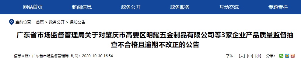 中國(guó)質(zhì)量新聞網(wǎng)訊 2020年10月30日,廣東省市場(chǎng)監(jiān)督管理局網(wǎng)站公告肇慶市高要區(qū)明耀五金制品有限公司等3家企業(yè)產(chǎn)品質(zhì)量監(jiān)督抽查不合格且逾期不改正的情況。