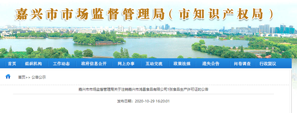嘉興市市場監(jiān)督管理局關(guān)于注銷嘉興市鴻昌食品有限公司1張食品生產(chǎn)許可證的公告