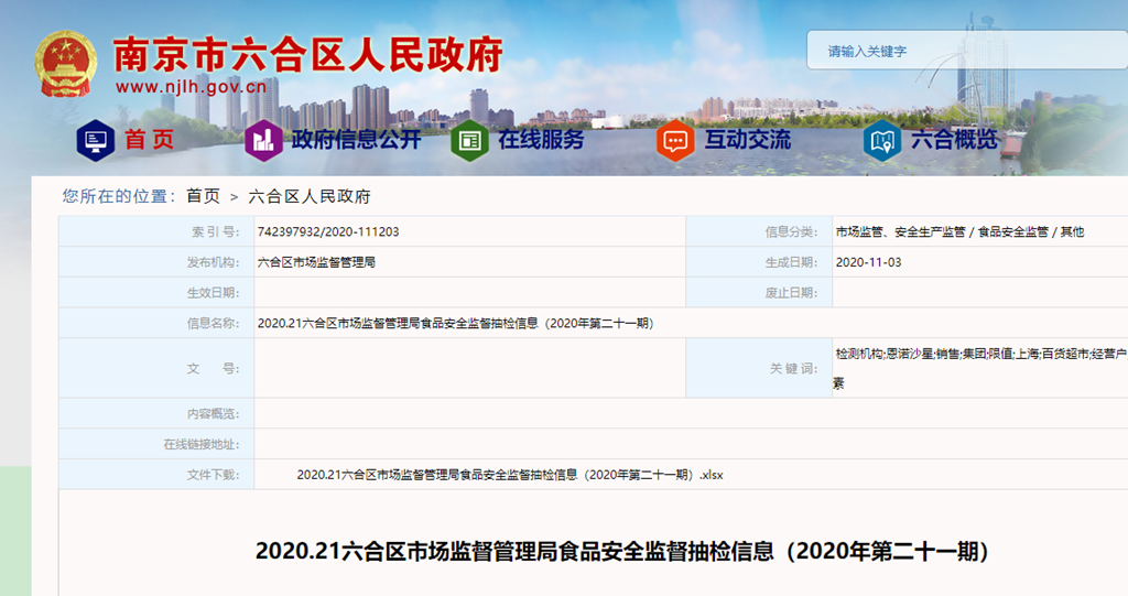 中國質量新聞網訊 江蘇南京市六合區(qū)人民政府網站11月3日發(fā)布“2020.21六合區(qū)市場監(jiān)督管理局食品安全監(jiān)督抽檢信息(2020年第二十一期)"。