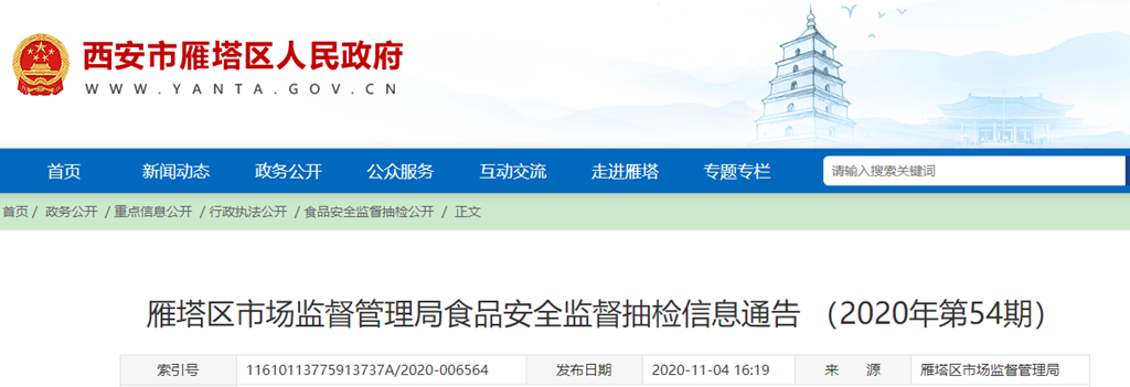 中國質量新聞網(wǎng)訊 陜西省西安市雁塔區(qū)人民政府網(wǎng)站11月4日發(fā)布雁塔區(qū)市場監(jiān)督管理局食品安全監(jiān)督抽檢信息通告 (2020年第54期)。