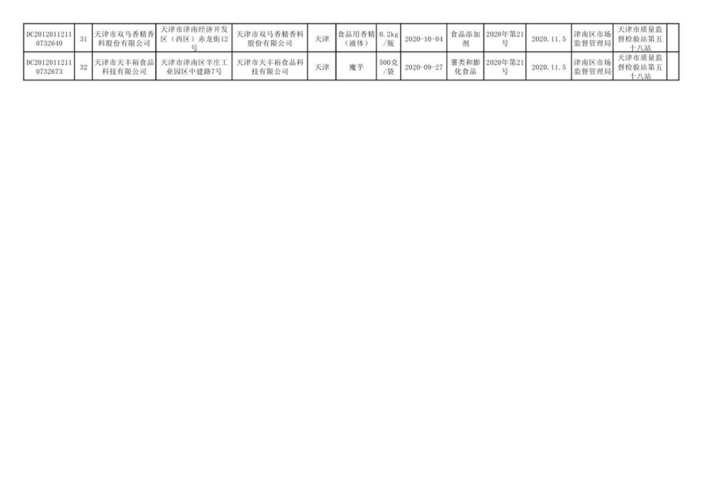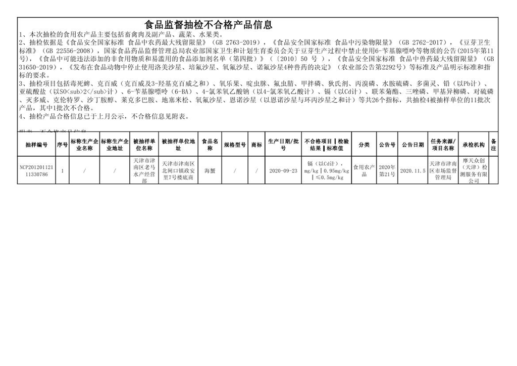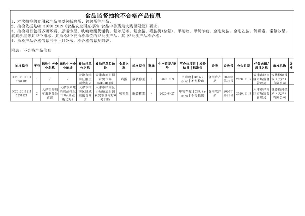 天津市津南區(qū)市場監(jiān)督管理局2020年第21期食品安全監(jiān)督抽檢信息