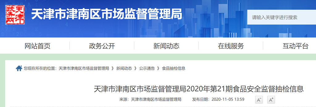 中國質(zhì)量新聞網(wǎng)訊 天津市津南區(qū)市場監(jiān)督管理局網(wǎng)站11月5日發(fā)布天津市津南區(qū)市場監(jiān)督管理局2020年第21期食品安全監(jiān)督抽檢信息。