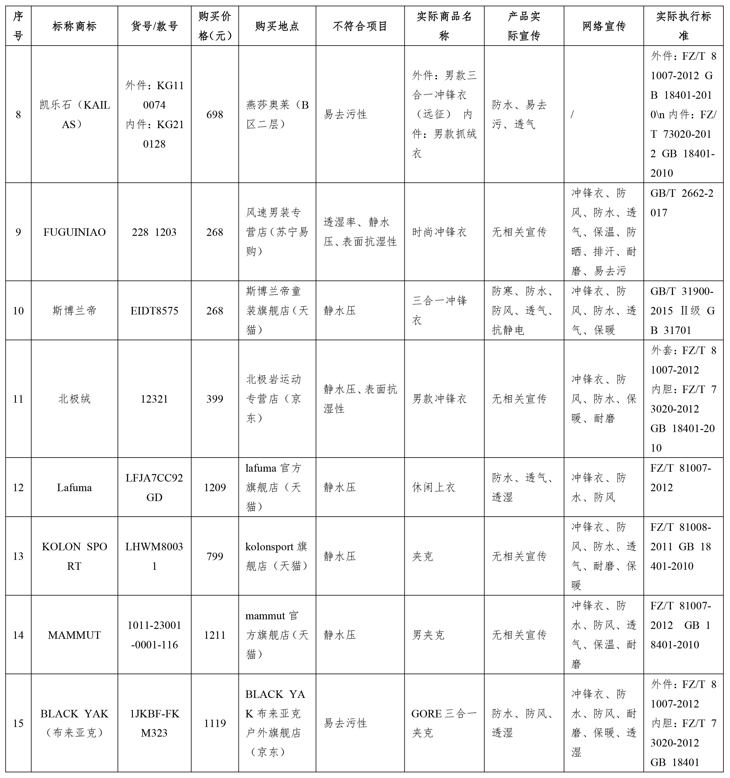 比較試驗(yàn)結(jié)果顯示,沖鋒衣樣品電商平臺(tái)與實(shí)體店相比存在問(wèn)題較多。為此,我們提示消費(fèi)者: