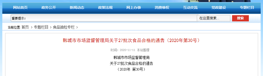 中國(guó)質(zhì)量新聞網(wǎng)訊 (記者 徐遠(yuǎn)官) 11月11日,陜西省韓城市市場(chǎng)監(jiān)督管理局官網(wǎng)發(fā)布關(guān)于27批次食品合格的通告(2020年第30號(hào))。通告稱,近期,該局組織抽檢食用農(nóng)產(chǎn)品27批次樣品,抽樣檢驗(yàn)項(xiàng)目全部合格。