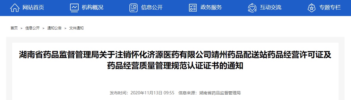 你公司關(guān)于申請注銷藥品經(jīng)營許可證和藥品經(jīng)營質(zhì)量管理規(guī)范認(rèn)證證書的報(bào)告收悉。根據(jù)你司申請,依據(jù)《藥品經(jīng)營許可證管理辦法》第二十六條和第三十條的規(guī)定,決定依法注銷懷化濟(jì)源醫(yī)藥有限公司靖州藥品配送站藥品經(jīng)營許可證(編號:湘AB7450061)和藥品經(jīng)營質(zhì)量管理規(guī)范認(rèn)證證書(編號:HN13-Ab-20150021)。