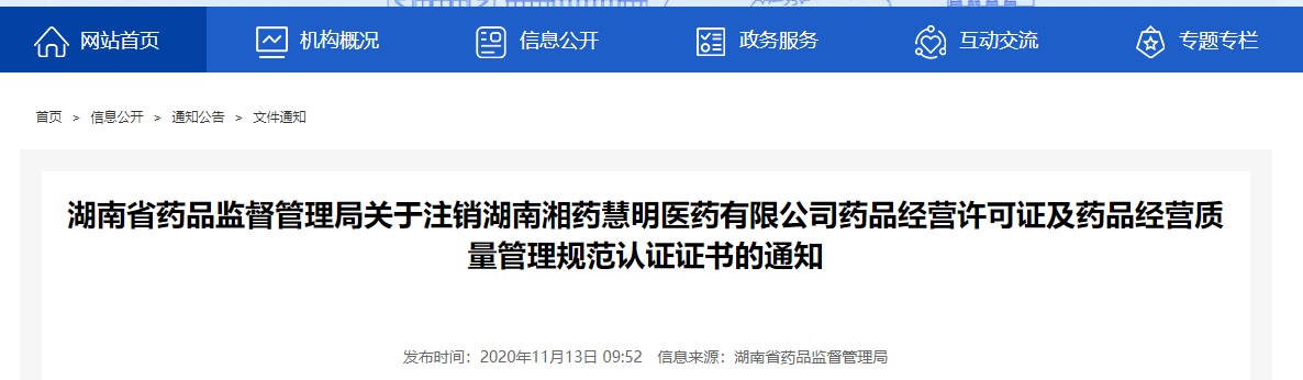 你公司關(guān)于申請注銷藥品經(jīng)營許可證和藥品經(jīng)營質(zhì)量管理規(guī)范認證證書的報告收悉。根據(jù)你司申請,依據(jù)《藥品經(jīng)營許可證管理辦法》第二十六條和第三十條的規(guī)定,決定依法注銷湖南湘藥慧明醫(yī)藥有限公司藥品經(jīng)營許可證(編號:湘AA7310480)和藥品經(jīng)營質(zhì)量管理規(guī)范認證證書(編號:HN01-Aa-20180026)。