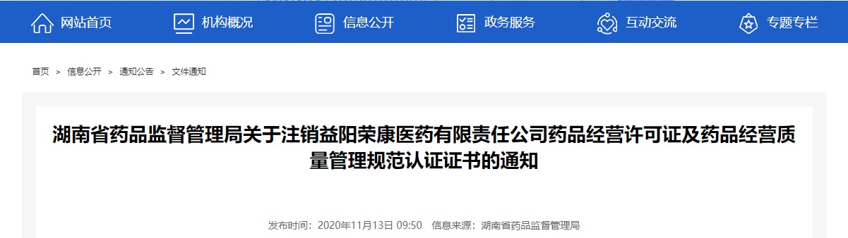 你公司關(guān)于申請注銷藥品經(jīng)營許可證和藥品經(jīng)營質(zhì)量管理規(guī)范認(rèn)證證書的報(bào)告收悉。根據(jù)你司申請,依據(jù)《藥品經(jīng)營許可證管理辦法》第二十六條和第三十條的規(guī)定,決定依法注銷益陽榮康醫(yī)藥有限責(zé)任公司藥品經(jīng)營許可證(編號:湘AA7370108)和藥品經(jīng)營質(zhì)量管理規(guī)范認(rèn)證證書(編號:HN08-Aa-20150133)。