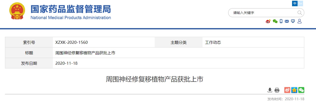 近日,國(guó)家藥品監(jiān)督管理局經(jīng)審查,批準(zhǔn)了江蘇益通生物科技有限公司生產(chǎn)的創(chuàng)新產(chǎn)品“周圍神經(jīng)修復(fù)移植物”注冊(cè)。