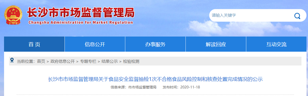 長沙市市場監(jiān)督管理局關(guān)于食品安全監(jiān)督抽檢1批次不合格食品風(fēng)險控制和核查處置完成情況的公示