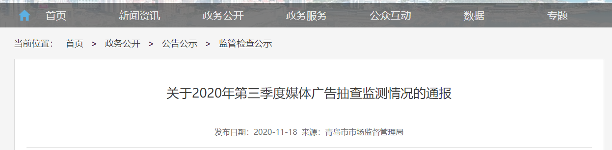 中國質(zhì)量新聞網(wǎng)訊 11月18日,山東青島市市場監(jiān)督管理局網(wǎng)站通報2020年第三季度媒體廣告抽查監(jiān)測情況。第三季度,該局共對全市43家電視、廣播、報紙等傳統(tǒng)媒體以及29個互聯(lián)網(wǎng)站的廣告發(fā)布情況進行了抽查監(jiān)測。其中,傳統(tǒng)媒體包括市級23家、區(qū)市級20家;市級媒體包括平面媒體9家,電視頻道8個,廣播頻率6個,區(qū)市級媒體包括電視頻道14個,廣播頻率6個。