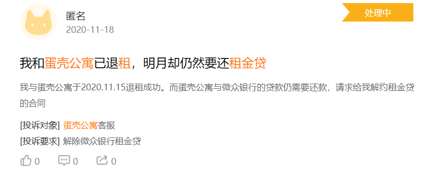中國質(zhì)量新聞網(wǎng)注意到,在黑貓投訴、聚投訴等平臺上也有不少租戶反映蛋殼公寓“租金貸”的問題。如:“已在蛋殼公寓退租,卻仍然要還租金貸。”“房東已和蛋殼解除合同,蛋殼未解除租房貸款?!?/p>