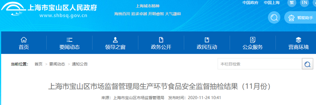 中國質(zhì)量新聞網(wǎng)訊 上海市寶山區(qū)人民政府網(wǎng)站11月24日發(fā)布上海市寶山區(qū)市場監(jiān)督管理局生產(chǎn)環(huán)節(jié)食品安全監(jiān)督抽檢結(jié)果(11月份)。
