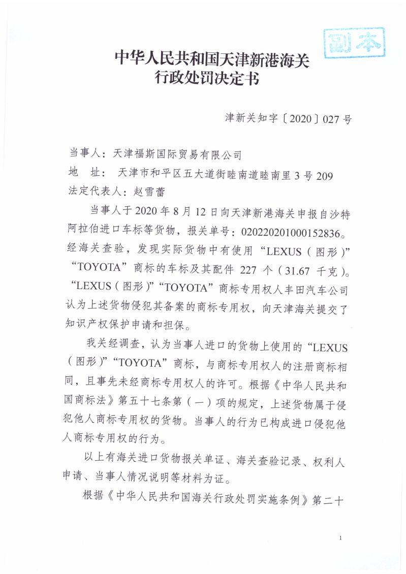 天津新港海關(guān)關(guān)于天津福斯國(guó)際貿(mào)易有限公司進(jìn)口侵犯“LEXUS(圖形)”“TOYOTO”商標(biāo)權(quán)車標(biāo)及其配件案行政處罰決定書(編號(hào):津新關(guān)知字〔2020〕027號(hào))