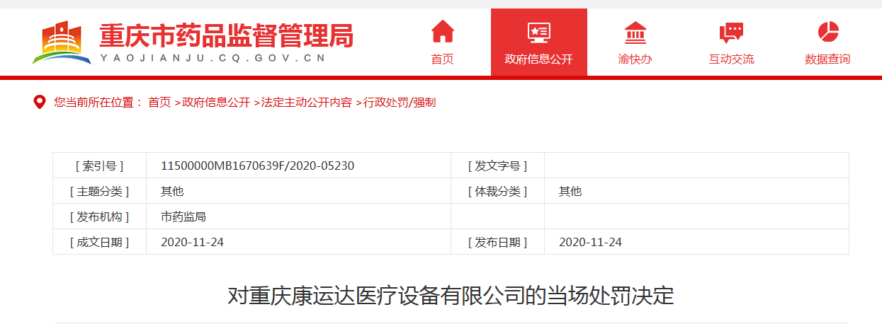 中國(guó)質(zhì)量新聞網(wǎng)訊 11月24日,重慶市藥品監(jiān)督管理局網(wǎng)站發(fā)布對(duì)重慶康運(yùn)達(dá)醫(yī)療設(shè)備有限公司的當(dāng)場(chǎng)處罰決定。