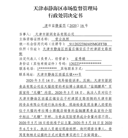 天津市靜海區(qū)市場(chǎng)監(jiān)管局行政處罰決定書(津市監(jiān)靜翟罰〔2020〕16號(hào))顯示,2020年5月14日,該局接到的投訴單反映,新潤(rùn)食品公司在天貓經(jīng)營(yíng)的考拉博士旗艦店“鹽焗腰果”頁(yè)面宣傳“無糖”內(nèi)容。2020年5月18日,執(zhí)法人員對(duì)新潤(rùn)食品公司進(jìn)行執(zhí)法檢查時(shí)發(fā)現(xiàn),其經(jīng)營(yíng)的位于天貓的考拉博士旗艦店銷售的鹽焗腰果食品宣傳介紹中標(biāo)注“無糖”字樣,與食品實(shí)際營(yíng)養(yǎng)成分含量?jī)?nèi)容不符,當(dāng)日該局予以立案。