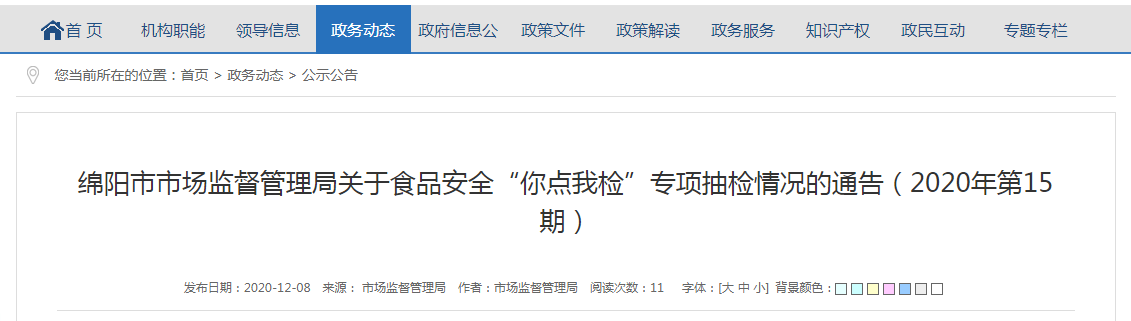 中國(guó)質(zhì)量新聞網(wǎng)訊 12月8日,四川省綿陽(yáng)市市場(chǎng)監(jiān)督管理局網(wǎng)站發(fā)布通告稱(chēng),為充分發(fā)揮社會(huì)各界的監(jiān)督作用,保障食品安全,該局前期組織開(kāi)展了食品安全“你點(diǎn)我檢”互動(dòng)活動(dòng)。
