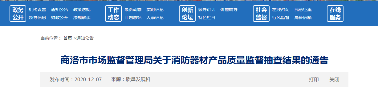 中國質(zhì)量新聞網(wǎng)訊 12月7日,陜西省商洛市市場監(jiān)督管理局網(wǎng)站公布消防器材產(chǎn)品質(zhì)量監(jiān)督抽查結(jié)果。