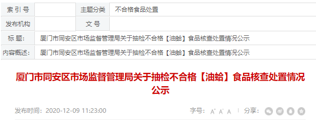廈門市同安區(qū)市場監(jiān)督管理局關(guān)于抽檢不合格【油蛤】食品核查處置情況公示