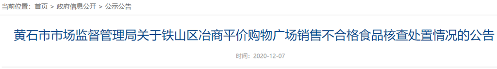 黃石市市場監(jiān)督管理局關(guān)于鐵山區(qū)冶商平價(jià)購物廣場銷售不合格食品核查處置情況的公告