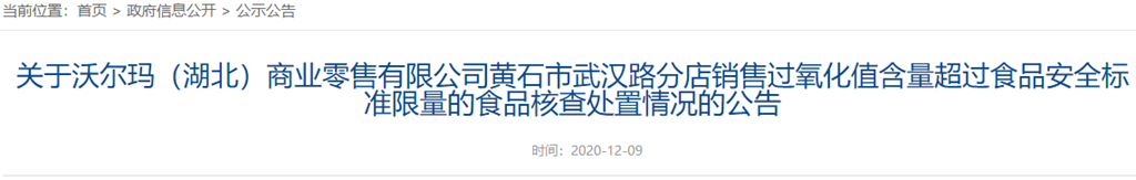 關(guān)于沃爾瑪(湖北)商業(yè)零售有限公司黃石市武漢路分店銷售過氧化值含量超過食品安全標(biāo)準(zhǔn)限量的食品核查處置情況的公告