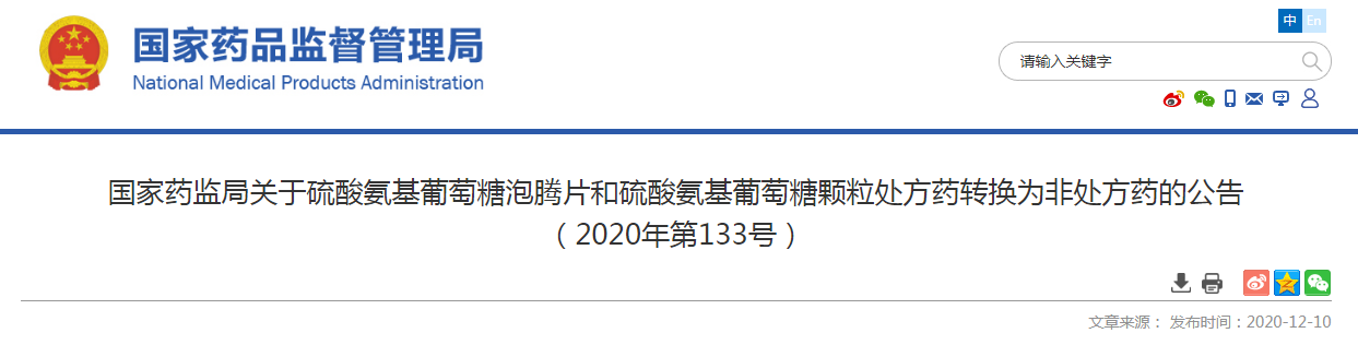 國家藥監(jiān)局關(guān)于硫酸氨基葡萄糖泡騰片和硫酸氨基葡萄糖顆粒處方藥轉(zhuǎn)換為非處方藥的公告(2020年第133號)