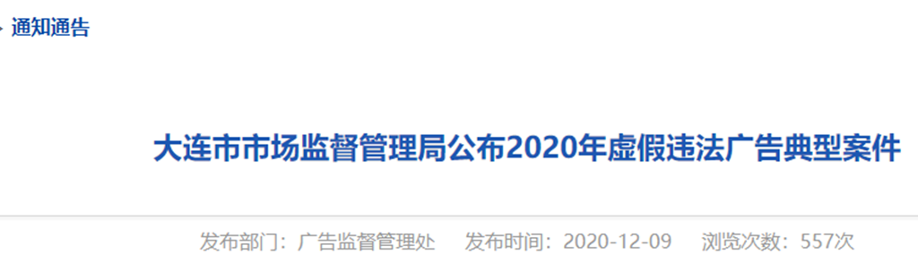 大連市市場監(jiān)督管理局公布2020年虛假違法廣告典型案件