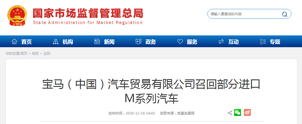 中國(guó)質(zhì)量新聞網(wǎng)訊 據(jù)市場(chǎng)監(jiān)管總局網(wǎng)站12月16日消息,日前,寶馬(中國(guó))汽車貿(mào)易有限公司根據(jù)《中華人民共和國(guó)大氣污染防治法》《缺陷汽車產(chǎn)品召回管理?xiàng)l例》及《缺陷汽車產(chǎn)品召回管理?xiàng)l例實(shí)施辦法》的要求,向國(guó)家市場(chǎng)監(jiān)督管理總局和生態(tài)環(huán)境部聯(lián)合備案了召回計(jì)劃。自即日起,召回生產(chǎn)日期從2017年11月22日到2020年9月7日的部分進(jìn)口X5M、X6M、M5及M8汽車,共計(jì)936臺(tái)。