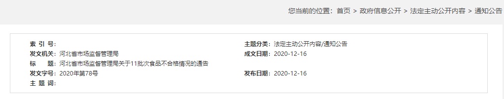 中國質(zhì)量新聞網(wǎng)訊 (記者陳娟女) 2020年12月16日,河北省市場監(jiān)督管理局網(wǎng)站發(fā)布關(guān)于11批次食品不合格情況的通告顯示,近期,河北省市場監(jiān)管部門抽檢27類食品1605批次樣品,檢驗合格1594批次,不合格11批次。根據(jù)食品安全國家標(biāo)準(zhǔn),個別項目不合格,其產(chǎn)品即判定為不合格產(chǎn)品。