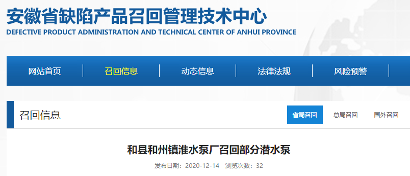 中國質(zhì)量新聞網(wǎng)訊 據(jù)安徽省缺陷產(chǎn)品召回管理技術(shù)中心網(wǎng)站12月14日消息,日前,和縣和州鎮(zhèn)淮水泵廠按照《消費(fèi)品召回管理暫行規(guī)定》的要求,主動(dòng)向安徽省市場(chǎng)監(jiān)督管理局、馬鞍山市市場(chǎng)監(jiān)督管理局報(bào)告了召回計(jì)劃,將自即日起,召回2020年10月13日生產(chǎn)的小型潛水泵(型號(hào):QDX3-16-0.37),涉及數(shù)量為6臺(tái)。