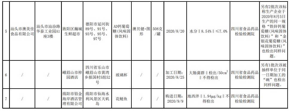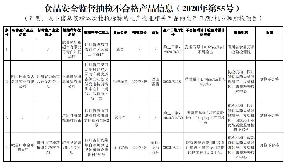 中國(guó)質(zhì)量新聞網(wǎng)訊 (記者陳娟女)2020年12月17日,四川省市場(chǎng)監(jiān)督管理局網(wǎng)站發(fā)布的關(guān)于食品安全監(jiān)督抽檢情況的通告?(2020年第55號(hào))顯示,近期,四川省市場(chǎng)監(jiān)督管理局組織食品安全監(jiān)督抽檢,抽取飲料、餐飲食品、食用農(nóng)產(chǎn)品、糖果制品、糧食加工品、食用油、油脂及其制品、特殊醫(yī)學(xué)用途配方食品、保健食品、茶葉及相關(guān)制品、蔬菜制品等10大類食品770批次樣品,檢出12批次樣品不合格。發(fā)現(xiàn)的主要問(wèn)題是質(zhì)量指標(biāo)不達(dá)標(biāo)、微生物污染、檢出禁限用農(nóng)獸藥、食品添加劑超限量使用等。