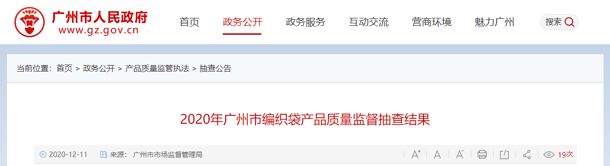 中國質(zhì)量新聞網(wǎng)訊 (記者 徐遠(yuǎn)官) 據(jù)廣州市人民政府網(wǎng)站消息,2020年第二季度,廣州市市場監(jiān)督管理局對編織袋產(chǎn)品質(zhì)量進(jìn)行了監(jiān)督抽查,共抽查了13批次樣品,經(jīng)檢驗,有4批次產(chǎn)品不符合標(biāo)準(zhǔn)要求。