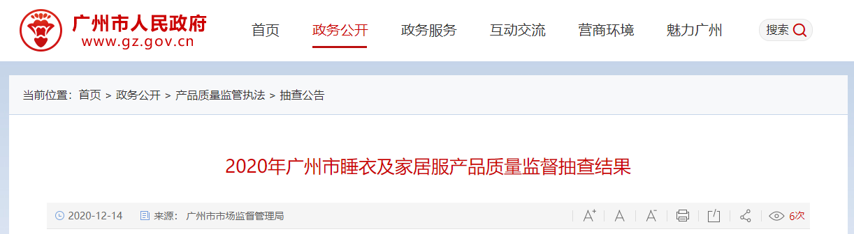 中國質(zhì)量新聞網(wǎng)訊 (記者 徐遠(yuǎn)官) 據(jù)廣州市人民政府網(wǎng)站消息,2020年第三季度,廣州市市場監(jiān)督管理局對睡衣及家居服產(chǎn)品質(zhì)量進(jìn)行了監(jiān)督抽查,共抽查了20批次樣品,經(jīng)檢驗(yàn),有7批次產(chǎn)品不符合標(biāo)準(zhǔn)要求。