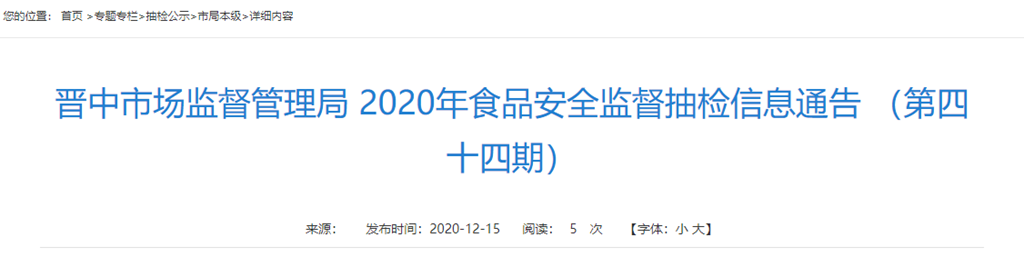 晉中市市場(chǎng)監(jiān)督管理局2020年食品安全監(jiān)督抽檢信息通告 (第四十四期)